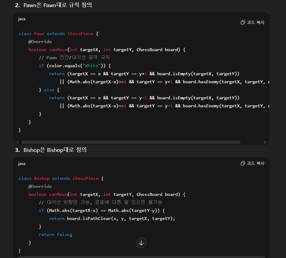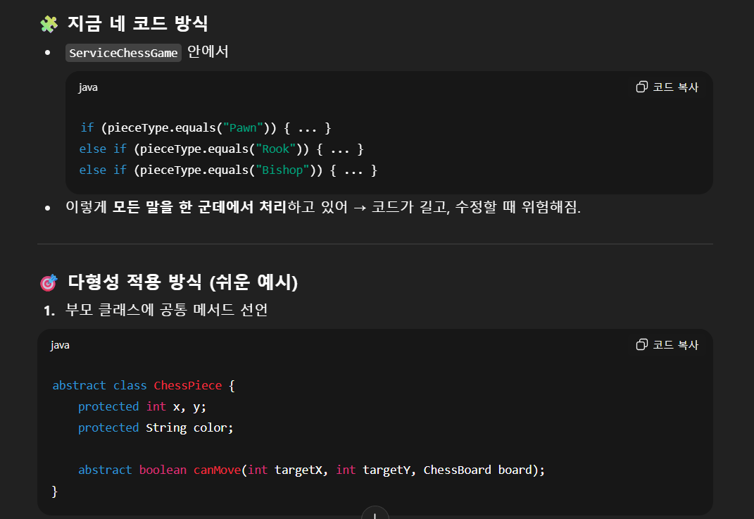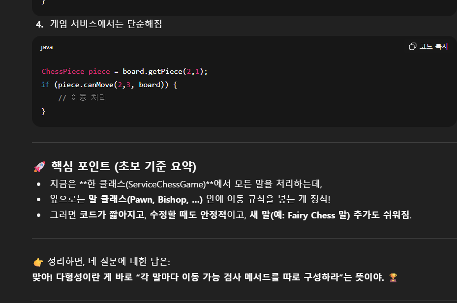 어쨋든 나는 chessGame 프로젝트 소스코드와 이 프로젝트의 설계 의도(?)를 ChatGPT에게 보낸 후, 피드백을 "현실적"으로 해달라고 했다.