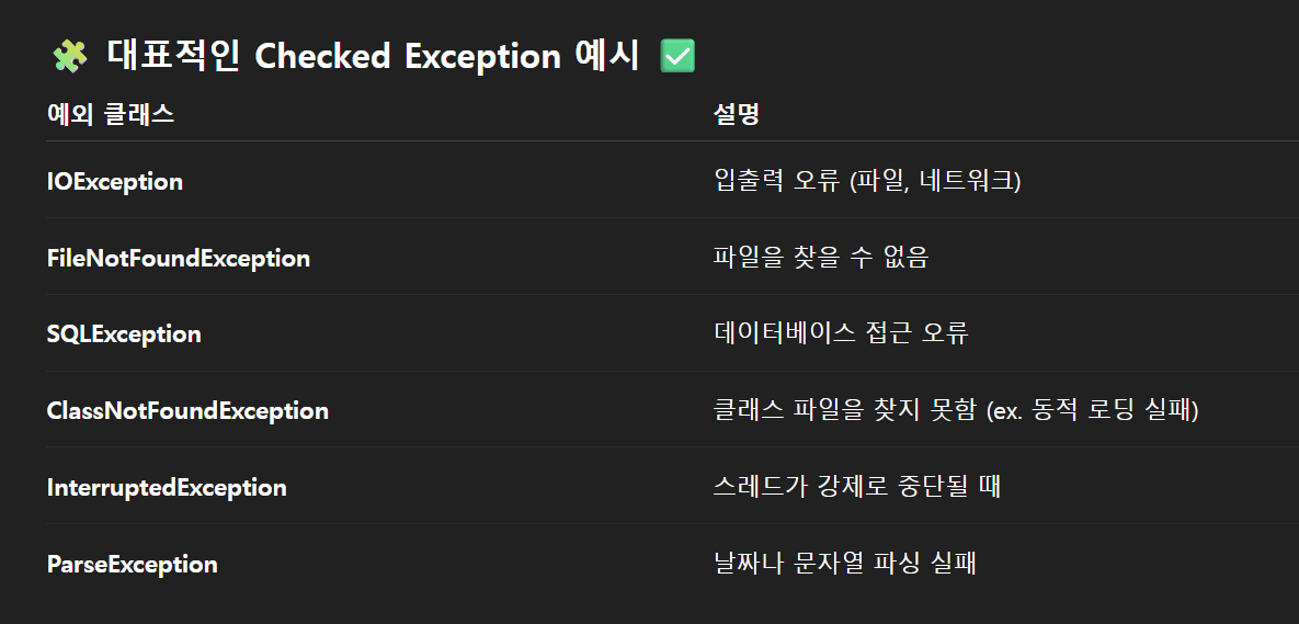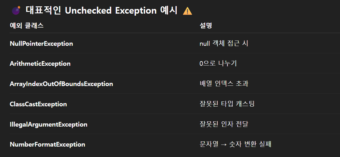 아래는 대표적인 Checked Exception과 Unchecked Exception의 예시이다. ( GPT 형님 )