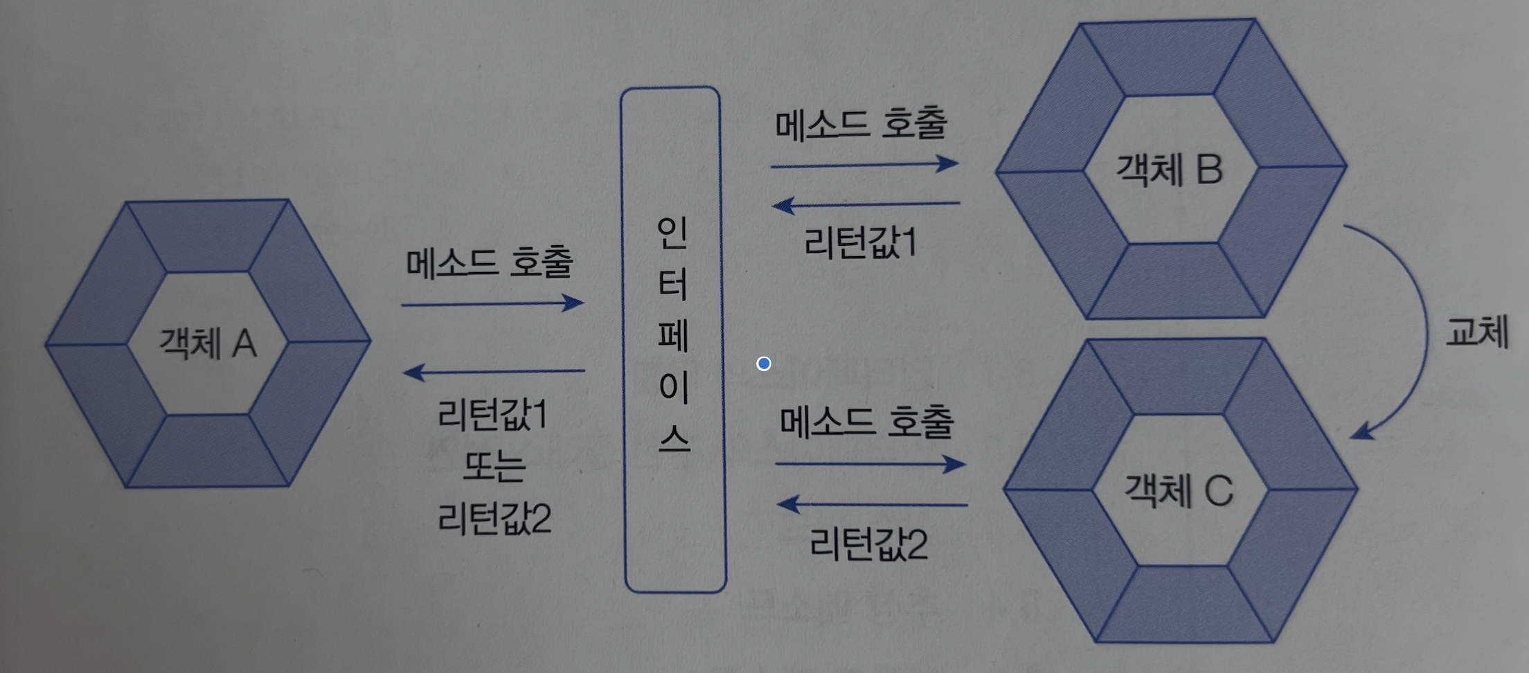 객체A는 인터페이스의 메소드만을 사용하므로, 객체B가 객체C로 변경되는 것에 대해서는 관심이 없다.