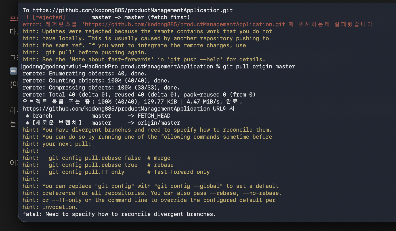 하지만, pull 명령어가 뭔데..? 어떤 역할이길래 현재 문제(현재 프로젝트의 원격 저장소와 로컬 저장소가 동기화되지 않음)를 해결할 수 있는 것일까..? ( pull을 하니, 어떻게 원격, 로컬 저장소를 reconcile할 것인지 묻고 있다.... 병합 관련 git 개념인가...?)