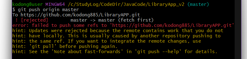 git - ! [rejected] master -> master (fetch first)error: failed to push some refs to < 레포지토리 주소 > 에러 해결하기